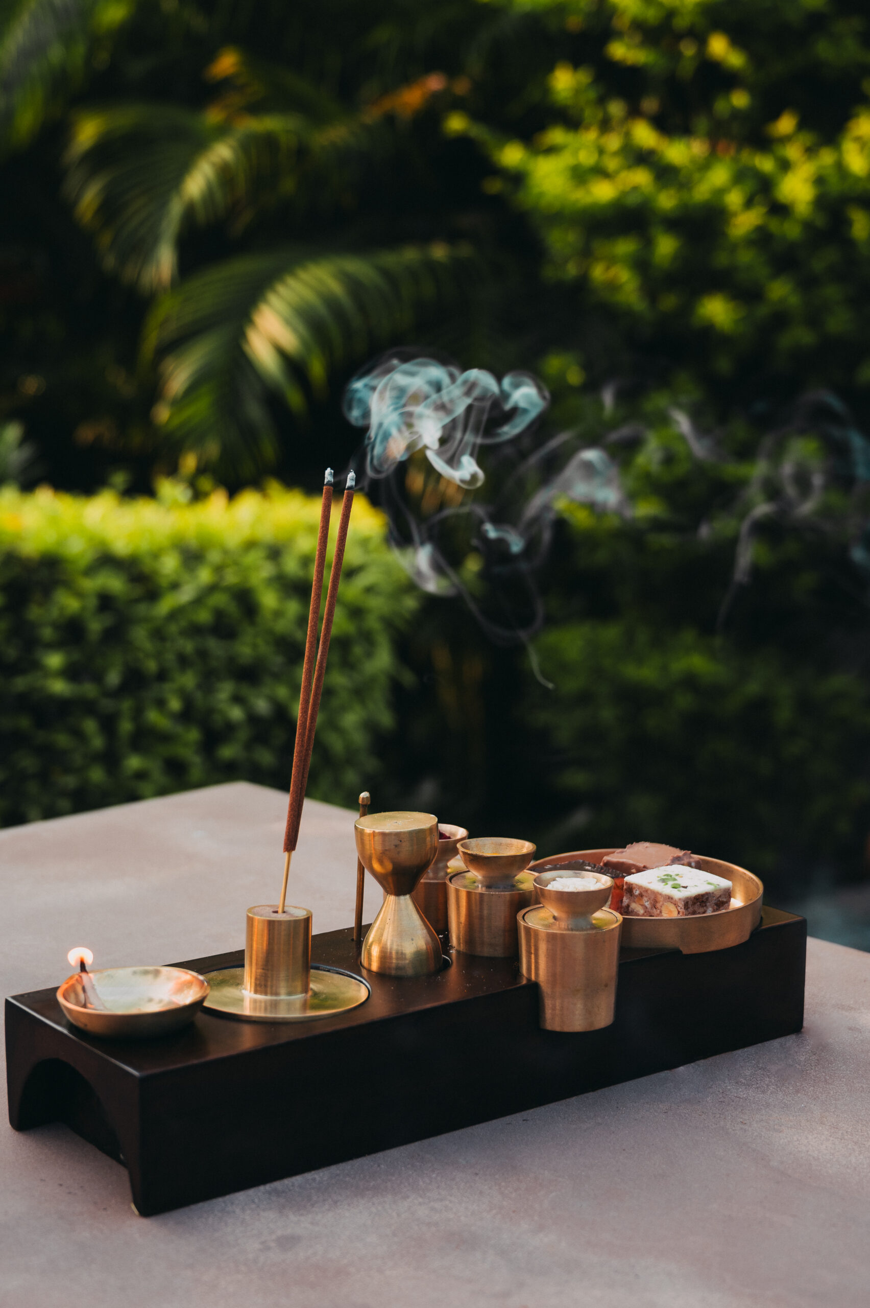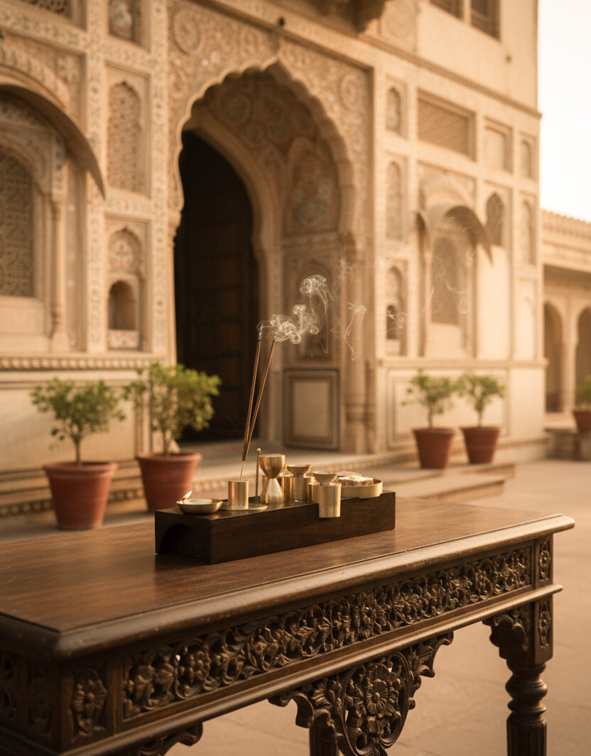 This handcrafted ritual set, inspired by the enduring strength of the Himalayas, features a solid wooden base paired with brass essentials.